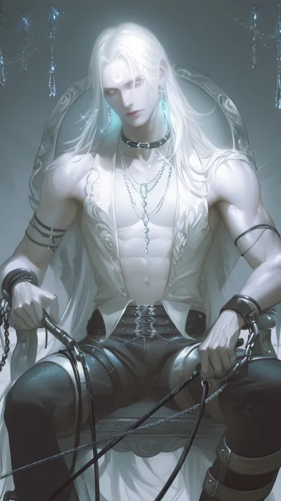 Midjourney Bot 更新时间:2026-01-30 00:27一个俊美美貌动漫男人,白色长发,坐着椅子上,皮鞭、腹肌、锁骨、恐怖气氛、锁链、项圈、腿环、(((背带))),胸肌,浅色唇,(((Gothic gloomy)))iridescence,钻石()水晶、流苏、亮片级联,肌肉线条流畅,冷白皮,动漫风格,串珠链叠戴,流光溢彩,细节,璀璨晶莹,holy light,数字艺术,高角度拍摄,柔和调色板,动漫插图,柔和冷光,sketching,anime风格,热爱太阳的人"动画系列中的人偶,洛可可风格,宁静的海洋主题,水手月亮漫画风格,单色宁静,浅白和浅蓝色,空灵而超凡脱俗的氛围,日系漫画风格,耳坠,立体光,淡蓝色,构图完美,细腻流畅线条,lines完整 --ar 9:16 --style raw --stylize 180 --niji 6 --no no