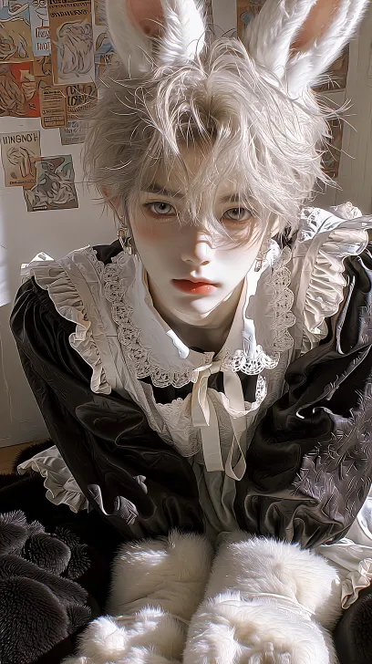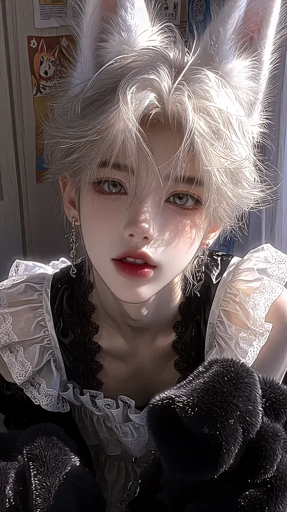Midjourney Bot 更新时间:2026-01-31 00:01一位穿着女仆装的男狐狸,男,皮肤白皙,狐狸眼,浅色瞳孔,高鼻梁,薄唇,唇瓣红润,有光泽,可爱感,纯欲感,穿着黑白色洛丽塔女仆装裙子,可爱感,白色中长度头发,鲻鱼头,蓬松富有光泽层次感,头上还有一对狐狸耳朵耷拉着,手上带着一对大型猫爪手套,面对着镜头,手放在身前形成猫的防御姿态,坐在地上,地上用黑色厚毛绒毯子铺好,背景是一面墙,墙上贴着很多海报,背景为亮色,碎光只打在人物脸上,BJD,高级CG,清晰感,8k高清,水润感,面部特写,线条流畅,三分法构图,复杂纹理,极致细节,逆光,超亮光线 --ar 9:16 --stylize 1000 --niji 7