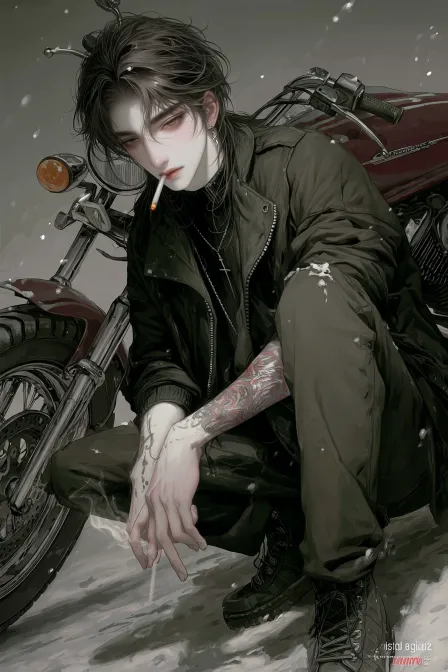Midjourney Bot 更新时间:2026-01-30 00:00红发炸毛,左耳闪银钉,小麦肤色配深棕锐眼。黑色机车夹克裹着精瘦身材,右颊带疤,左臂火焰纹身蔓延。牛仔裤磨损,靴子沾灰,嘴角懒散叼着根烟。 --ar 2:3 --v 7 --stylize 100 --sref https://images.gogpt.vip/aigf/m_origin/20260129/2044309/ztv8ae30fm5vvf2d.jpg --oref https://images.gogpt.vip/aigf/m_origin/20260129/2044309/hbps4mjkhzou2vs4.jpg --ow 400