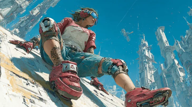 Midjourney Bot 更新时间:2026-01-30 00:069风格类型: 数字油画,莫比乌斯艺术风格,复古未来主义风格,极繁主义风格。 色彩和光影方案: 高饱和纯蓝天空背景,强烈的侧逆光和刀锋状硬阴影,高对比色彩,腿部肌肤柔光与机甲硬阴影冷暖对冲。镜头设计要求,极低摄影位置,向上仰拍女骑手的角度。细节特征: 人物或者动物和其他主体,画面层次丰富、装饰性强,小腿分段式机甲嵌莫比乌斯雕花+发光能量条,车轮轮圈为超大莫比乌斯环形,大腿纹身为银色立体莫比乌斯造型,细链吊坠为迷你莫比乌斯,机甲雕花呈立体浮雕质感,划痕与氧化斑点自然,能量条与雕花嵌套精准,靴子破损边缘毛边磨损自然,脚踝细链反光柔和,轮体管线与莫比乌斯轮圈嵌套,铆钉为复古圆形,有做旧感。电影级高品质画质,数字油画笔触凸显腿部肌肤细腻与机甲坚硬冰冷的质感反差,硬阴影勾勒腿部肌肉线条与机甲纹路,纹身浮雕质感与光影反射精准,突出腿部造型的性感与科技感。 --ar 16:9 --v 7 --style raw --stylize 250 --no 任何文字,中文,英文,韩文,日文,任何字符