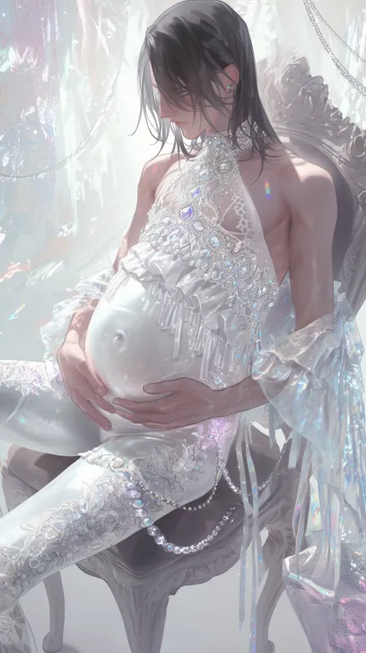 Midjourney Bot 更新时间:2026-01-30 00:06bird's eye view。一个俊美男人,怀孕,黑色直发,发光,白色蕾丝挂脖式连体衣,宽肩细腰,腹肌可见,冷白皮,坐在椅子上,褶皱、花朵、水晶、繁复、蕾丝、花边、复古、束腰,(((Gothic gloomy)))iridescence,钻石()水晶、流苏、亮片级联,双腿细长,肌肉线条流畅,冷白皮,动漫风格,串珠链叠戴,流光溢彩,细节,璀璨晶莹,holy light,数字艺术,高角度拍摄,柔和调色板,动漫插图,柔和冷光,厚涂插画,动漫插图,清晰8K,浅色hue,坐在椅子上, --ar 9:16 --style raw --stylize 180 --niji 6 --no no
