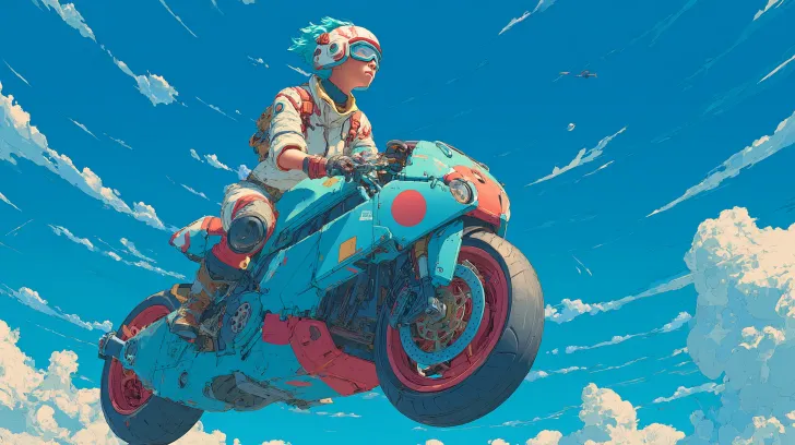 Midjourney Bot 更新时间:2026-01-30 00:0718全景(极低仰拍)风格类型: 数字油画,莫比乌斯艺术风格,复古未来主义风格,极繁主义风格。 色彩和光影方案: 高饱和纯蓝天空背景,强烈的侧逆光和刀锋状硬阴影,高对比色彩,多色能量光交织与天空纯蓝高反差,远近光影层次分明。镜头设计要求,极低摄影位置,向上仰拍女骑手的角度。细节特征: 人物或者动物和其他主体,画面层次丰富、装饰性强,全画面莫比乌斯元素呼应统一,骑手机甲、摩托、飞船、卫星、平台的莫比乌斯纹路风格一致,层层嵌套呈立体浮雕质感,各部位能量光同步闪烁,粒子感自然,机甲与人体衔接处过渡自然,飞船与卫星的做旧痕迹与骑手机甲呼应,能量屏障光斑为莫比乌斯造型,远近物体的细节刻画有区分(近景精细,远景柔和)。电影级高品质画质,数字油画笔触完美融合各元素质感(皮肤/金属/能量/皮革),硬阴影勾勒所有轮廓,纹路与能量光的光影细节精准,整体画面宏大且细节饱满,兼具科幻感与艺术感。 --ar 16:9 --v 7 --style raw --stylize 250 --no 任何文字,中文,英文,韩文,日文,任何字符
