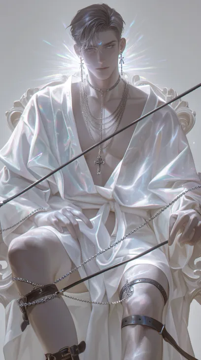 Midjourney Bot 更新时间:2026-01-30 00:10一个俊美美貌动漫男人,白色长袍,翘着腿坐着椅子上,皮鞭、腹肌、锁骨、恐怖气氛、锁链、项圈、腿环、(((背带))),胸肌,浅色唇,(((Gothic gloomy)))iridescence,钻石()水晶、流苏、亮片级联,肌肉线条流畅,冷白皮,动漫风格,串珠链叠戴,流光溢彩,细节,璀璨晶莹,holy light,数字艺术,高角度拍摄,柔和调色板,动漫插图,柔和冷光,sketching,anime风格,热爱太阳的人"动画系列中的人偶,洛可可风格,宁静的海洋主题,水手月亮漫画风格,单色宁静,浅白和浅蓝色,空灵而超凡脱俗的氛围,日系漫画风格,耳坠,立体光,淡蓝色,构图完美,细腻流畅线条,lines完整 --ar 9:16 --style raw --stylize 180 --niji 6 --no no