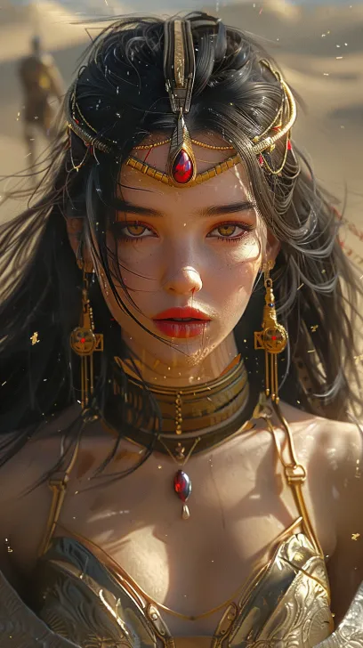 Midjourney Bot 更新时间:2026-01-30 00:13一位拥有绝美东方面孔的女战神,皮肤白皙,妆容精致,眼尾带红,唇色鲜艳,黑色大波浪卷发蓬松且富有光泽,佩戴着金色的华丽头饰与垂坠感耳饰。 服装风格:身着古埃及 / 美索不达米亚风格的黄金战甲,战甲采用镂空雕刻工艺,布满复杂花纹与宝石镶嵌,露肩设计搭配不对称臂甲,下装是轻盈的米白色纱质战裙,边缘点缀金线。 武器道具:手持一把黄金权杖与一面镶嵌着暗红色宝石的圆盾,盾牌表面有精致的浮雕纹路,带有斑驳的战损质感。 场景与氛围 背景环境:在一望无际的荒漠沙丘中,远处有模糊的军队骑兵轮廓,营造出宏大的史诗战场感。 光线与色调:采用暖黄色调的自然光,光线柔和且带有轻微的漫射效果,整体画面呈现出复古油画般的质感,带有轻微的颗粒感与朦胧滤镜。 情绪与姿态:人物步伐坚定,眼神冷峻,气场强大,仿佛正走向战场,传递出既神圣又充满力量的压迫感。 技术风格 画面质感:超写实主义,融合古典油画与数字绘画的细腻笔触,强调金属的反光质感与布料的垂坠感。 构图与视角:中景构图,人物位于画面中心,采用低角度仰拍增强人物的威严感。 AI 生成参数: --ar 9:16 --v 6.0 --stylize 250