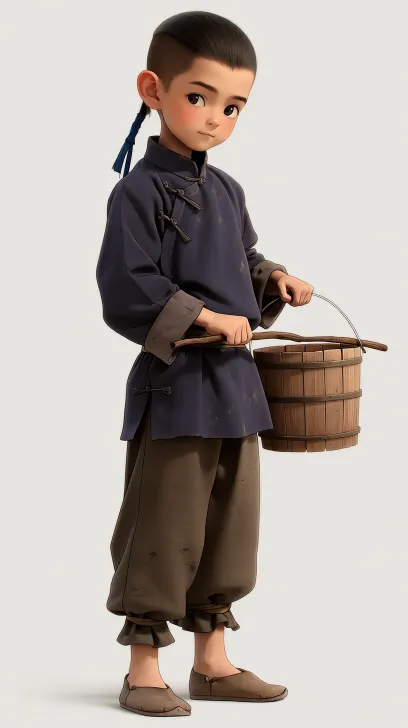 Midjourney Bot 更新时间:2026-01-30 00:146岁唐三全身角色概念图,虚幻引擎5电影级渲染,3D动漫写实风格,PBR流程。 【角色与气质】一个来自贫困村庄的小男孩,散发着超越年龄的沉稳与成熟。双眼明亮而善于观察,暗示着深邃的过往。 【全身造型与姿态】动态站姿。捕捉他正在行动的一瞬:例如用树枝轻轻拨动泥灶炉火,或小心地提着一个木桶。他的姿势平衡而稳健,展现出因无形修炼(玄天功)而具备的自然优雅与基础力量。姿态应充满叙事感与生机,而非静止。 【面部与发型】孩童柔和的五官,带着专注、平静的表情。整洁的黑色直短发。关键细节:一缕极细的三股辫,用深蓝色丝线系住,谨慎地藏在左耳后。 【服装细节】穿着干净但明显陈旧、带补丁的朴素衣服。一件深蓝色交领粗麻衫,带有不显眼的补丁(最明显的是左胸上方一块精密、缝线整齐的补丁)。宽松的褐色裤子,脚踝处束起。简单的布鞋。衣物因日常劳作呈现轻微褪色和污渍。 虚幻引擎5,景深, --ar 9:16 --stylize 100 --niji 7 --no 去掉水印