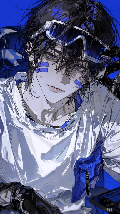 Midjourney Bot 更新时间:2026-01-30 00:14少年,黑色蓬松短发,蓝色发卡,小贴纸贴脸,白色长袖遮手宽松有蓝色口袋装饰衣服,戴黑色手套,头发上有着护目镜,耳饰 痞气感,淘气感,顽皮感,疯批感, 远距离,眉眼狭长,眼尾微挑,背景为蓝色主题的卧室,有电竞椅子,床,和桌子 单手拿头上的墨镜,俯视角,脸部有近距离描写,放大特写,抬眼看镜头,单手比耶 bjd质感脸部,超高清画质,高级cg插画,柔光,明暗分明,有阴影描写, --ar 9:16 --stylize 764 --niji 7