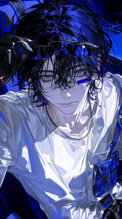 Midjourney Bot 更新时间:2026-01-30 00:14少年,黑色蓬松短发,蓝色发卡,小贴纸贴脸,白色长袖遮手宽松有蓝色口袋装饰衣服,戴黑色手套,头发上有着护目镜,耳饰 痞气感,淘气感,顽皮感,疯批感 远距离,眉眼狭长,眼尾微挑,背景为蓝色主题的卧室,有电竞椅子,床,和桌子 单手拿头上的墨镜,俯视角,脸部有近距离描写,放大特写,抬眼看镜头,单手比耶 bjd质感脸部,超高清画质,高级cg插画,柔光,明暗分明,有阴影描写, --ar 9:16 --stylize 764 --niji 7