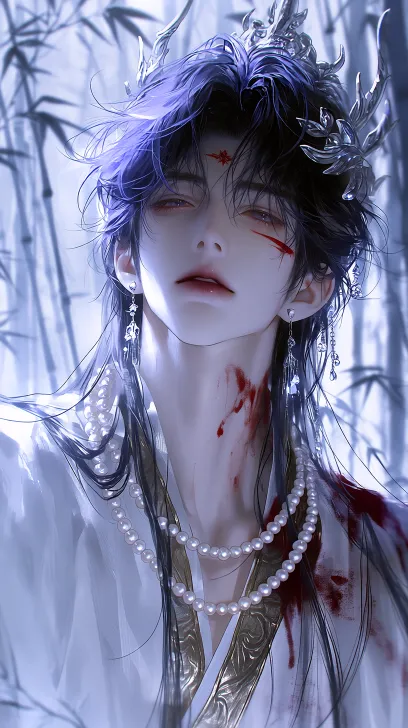 Midjourney Bot 更新时间:2026-01-28 00:19BJD,高级CG,清晰感,8k高清,男,细腻手绘风格,一位清冷矜贵的古风美男,一头墨黑长发挑染蓝紫渐变,发丝凌乱蓬松,头顶戴着金属质感的龙角发冠,额间有银色花钿,眼下有淡红泪痣,耳戴垂坠式水晶耳饰,身着镶金边的素白广袖长袍,颈间佩戴多层珍珠项链,背景是朦胧的水墨竹林,冷白调柔光,整体氛围带着宿命感与破碎美感,笔触细腻锐利,高对比度,8K高细节,竖版构图,高鼻梁,皮肤白皙,丹凤眼,薄唇,面部特写,线条流畅,暗黑风格,红色喷射型染料在在脸上和身上一大片 --ar 9:16 --stylize 1000 --niji 7