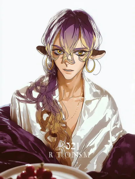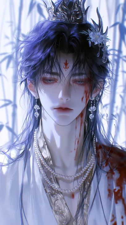 Midjourney Bot 更新时间:2026-01-28 00:19BJD,高级CG,清晰感,8k高清,男,细腻手绘风格,一位清冷矜贵的古风美男,一头墨黑长发挑染蓝紫渐变,发丝凌乱蓬松,头顶戴着金属质感的龙角发冠,额间有银色花钿,眼下有淡红泪痣,耳戴垂坠式水晶耳饰,身着镶金边的素白广袖长袍,颈间佩戴多层珍珠项链,背景是朦胧的水墨竹林,冷白调柔光,整体氛围带着宿命感与破碎美感,笔触细腻锐利,高对比度,8K高细节,竖版构图,高鼻梁,皮肤白皙,丹凤眼,薄唇,面部特写,线条流畅,暗黑风格,红色喷射型染料在在脸上和身上一大片 --ar 9:16 --stylize 944 --niji 7