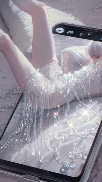 Midjourney Bot 更新时间:2026-01-28 00:19手机屏幕上一张照片:(gorgeous俊美动漫20岁年轻男人躺在床上,白色米钻蕾丝旗袍,(((Gothic gloomy)))iridescence,钻石()水晶、流苏、亮片级联,双腿细长,肌肉线条流畅,冷白皮,动漫风格,串珠链叠戴,流光溢彩,细节,璀璨晶莹,holy light,数字艺术,高角度拍摄,柔和调色板,动漫插图,柔和冷光) --ar 9:16 --style raw --stylize 180 --niji 6 --no no