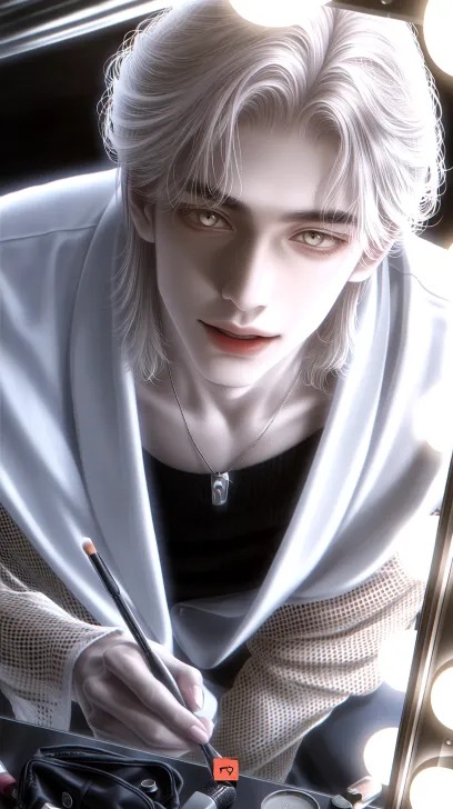 Midjourney Bot 更新时间:2026-01-28 00:19https://images.gogpt.vip/aigf/m_origin/20260128/2034231/a0v4zvnu8j4pkfsc.png 一位妩媚的男性,浅色蓬松飘逸长发发量浓密,骨相清隽优越,眉骨高挺,眉峰锋利,眉形纤细规整,浅瞳色,眼型狭长,眼尾微垂,眼裂宽度适中,眼睫纤长浓密,排列整齐,眼神明亮鲜活,眸光清澈透亮,无杂质,眼白洁净,虹膜颜色均匀,眼周光影干净,薄唇微扬,唇色自然红润,唇线清晰分明,唇形饱满,下颌线清晰流畅,下颌角弧度柔和,面部轮廓立体,冷白皮,面部光影过渡自然,自带柔光感,一只手里拿着化妆笔,指甲修剪整齐,质地透亮莹润,光泽感自然,身穿亚麻色渔网镂空宽松毛衣,内搭黑色修身上衣,颈间点缀银色金属挂饰,韩系细腻笔触,明亮自然光,高饱和通透色调,他的表情温柔,妩媚,独特艺术氛围感,中心构图,活力明朗氛围拉满,高清极致细节,人物比例精准,面部五官轮廓分明,皮肤纹理清晰可见,画面光影柔和,背景是化妆间,他坐在围着一圈灯泡的巨大方形化妆镜前,收拾着桌子上的化妆品,座子上有散落的化妆品和一个黑色的化妆包。 --ar 9:16 --c 68 --weird 281 --stylize 1000 --niji 7 --sref https://images.gogpt.vip/aigf/m_origin/20260128/2034231/6rmkx9vjej09rn5y.png --sw 651 --no 精灵耳朵,