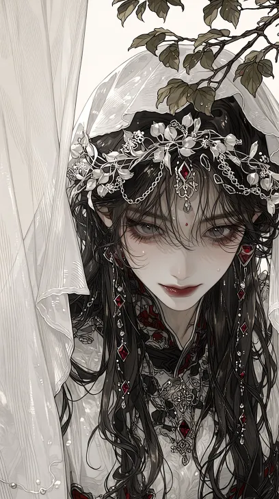 Midjourney Bot 更新时间:2026-01-28 00:19新婚将军,浓颜立体的东方五官,白色丝纱缠绕上身,银色泛光的黑色头发湿发,头上带着银丝缠绕的花环,长发及腰,碎发微微凌乱,红钻白钻点缀钻点缀,肩链,诡异感,透视,伪厚涂插画,深邃病娇精致的眼睛,水润亮泽嘴唇,狡黠眼眸,危险,面部特写,浅色瞳孔睫毛,插画线稿,细腻线条,菩提树的树枝树叶在右上方引出,画面横飘过两张丝纱帘子,面部特写,上眼睫毛清晰根根分明,高级cg渲染,男人,水润亮泽嘴唇,bjd面容基调 --ar 9:16 --c 15 --stylize 600 --niji 7 --no 侧脸,脸部特写,3D画风,现实画风,扭曲脸部,奇怪比例,非p值画风,人物畏手畏脚,人物模糊,害羞,可爱,萌妹子,萌,幼态脸,眼睛发光,仰头,大红厚嘴唇,水滴,丝带,绷带,不要仰头,不要平面