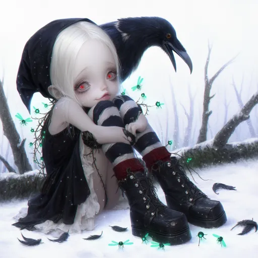Midjourney Bot 更新时间:2026-01-29 06:05乌鸦+萤火:暗夜渡灵 鸦黑长发缠枯藤与乌鸦羽,苍白小脸嵌猩红竖瞳,唇衔半根乌鸦翎。破洞黑纱裙沾腐叶,肩头停着独眼乌鸦,指尖浮幽绿萤火,光点缠乌鸦翅尖。身后古木虬枝如鬼爪,萤火照出满地鸦羽,乌鸦嘶鸣时萤火骤明,映她嘴角冷冽笑,森气裹着诡异贵气。 --ar 1:1 --c 70 --stylize 750 --niji 6 --sref https://images.gogpt.vip/aigf/m_origin/20260109/1580997/npmc2lti540nky9z.jpg --sw 228 --profile u8nq37r --no ロークオリティ。大雑把。雑な表情。普通な背景。普通なポーズ。普通な視点