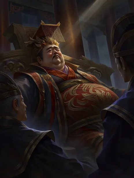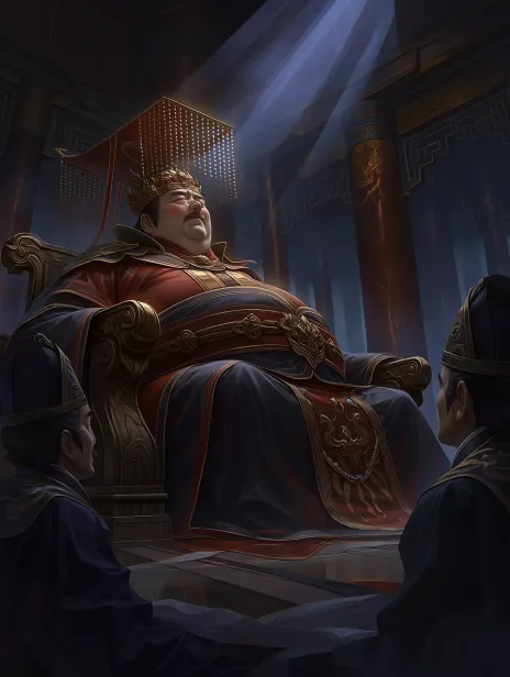 Midjourney Bot 更新时间:2026-01-29 06:26https://images.gogpt.vip/aigf/origin/20260127/1769527906074583_3.png 司马衷,肥胖中年男人,坐在龙纹大椅子上。脸色白,眼睛看地。头戴中国古代皇帝的那种平顶冠帽,帽子前后挂着一串串珠子,帽子是金色的,戴歪了。 穿红黑衣服,衣服有金线龙纹,肚子处衣服绷紧。一道白光从头顶照他。 左下角,黑色老人影子,侧面,戴平顶冠帽。右上角,黑色年轻人影子,侧面,戴有横梁的冠帽。影子在暗处。 背景是模糊的中国宫殿大柱子。厚涂画风,颜色黑、白、红、暗金。 --ar 3:4 --stylize 791 --iw 0.5 --niji 7 --sref https://images.gogpt.vip/aigf/m_origin/20260126/2037869/iwvu3iomvj4qh6nh.jpeg --sw 433