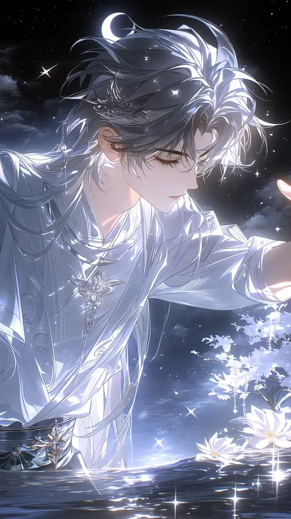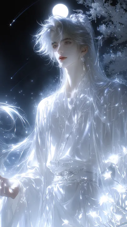 Midjourney Bot 更新时间:2026-01-29 06:53美男子,银色齐腰蓬松飘逸凌乱长发,发丝闪闪发光,白色古代长袍,有花纹束腰,高级绸缎,面料丝滑,眼睫毛长,眼睫毛为白色,看镜头,头发有发簪,水光唇,微低头,他伸出左手,挥向一旁,头顶有着白色月亮,夜晚天空有流星划过,周围有雾飘在周围,一颗纯白的开着白花的树,地上有白色的花挡住屏幕的一角,整体突出仙气感,神秘感,意境感,幽静感,氛围感,场景为夜晚,星光闪烁,周围有闪光,只有月光有光打在人物身上,周围比较暗,近距离描写 突出角色的神秘感,亮感,头发上打光 bjd质感脸部,线条流畅,画质为超高清画质,柔光,仰视角 --ar 9:16 --c 22 --weird 931 --stylize 764 --niji 7 --no 精灵耳朵,