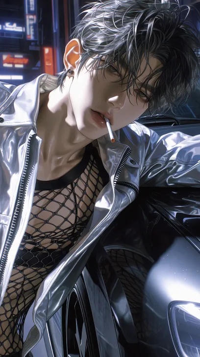 Midjourney Bot 更新时间:2026-01-27 00:01细腻BJD厚涂插画纹理,帅气动漫少年,纹理感黑色碎发,凌厉五官,慵懒微眯眼,嘴里叼烟,白色皮质夹克敞开,黑色渔网内搭,斜靠在流线型哑光黑超跑旁,赛博朋克都市夜街,霓虹广告牌环境光,半身镜头,居中构图,明亮平面白光主光源,冷调氛围感,精致细节渲染,二次元厚涂油画风,写实质感细节,干净电影感构图 --ar 9:16 --stylize 578 --niji 7