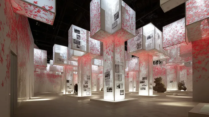 Midjourney Bot 更新时间:2026-01-27 00:02中式奇幻美学展厅。模仿电影大师阿莫多瓦风格,模仿电影《红楼梦》。波普风格,自然太空时代氛围。超大长条形室内空间,模块化造型方形柱子,柱子上挂着照片,梅花元素,五行元素模块化梅花元素区域,二十四节气元素,符号学。造型吊顶,发光灯膜。白色,玫红色。 --ar 16:9 --v 7 --stylize 100