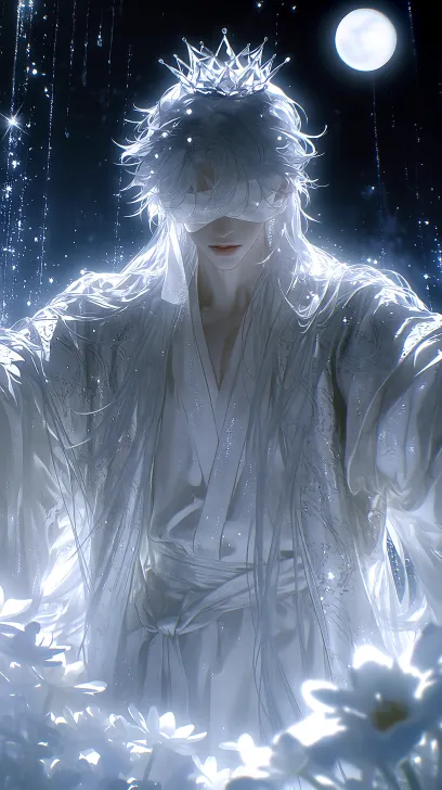 Midjourney Bot 更新时间:2026-01-27 00:02美男子,银色齐腰蓬松飘逸凌乱长发,发丝闪闪发光,白色古代长袍,有花纹束腰,衣服长而遮手,高级绸缎,面料丝滑,眼睫毛长,眼睫毛为白色,闭上眼睛眼睛被白色绷带缠着,风吹起绑带的末尾,头顶浮空着如此水晶石一样闪闪发亮的皇冠,水光唇,微低头,头顶有着白色月亮,夜晚天空有流星划过,周围有雾飘在周围,地上有白色的花挡住屏幕的一角,整体突出仙气感,神秘感,意境感,幽静感,氛围感,场景为夜晚,星光闪烁,周围有闪光,只有月光有光打在人物身上,周围比较暗,地上如同水面一样一着倒影,正脸,正面视角,展开双臂 脸部有放大特写,近距离描写 突出角色的神秘感,亮感,头发上打光 bjd质感脸部,线条流畅,画质为超高清画质,柔光,仰视角 --ar 9:16 --stylize 764 --niji 7