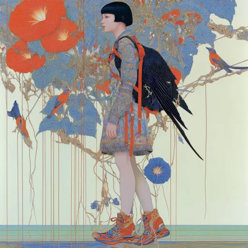 Midjourney Bot 更新时间:2026-01-27 00:04主体:玻璃罩、被缠着有黑色翅膀的女人,牵牛花 元素:挂满红绸的大树、被牵牛花缠住的向日葵、牵牛花缠住的鸟 主体细节描述:绿色水面上漂浮的玻璃质感的玻璃容器,容器里有一棵挂满红绸的大树,一位背上有黑色翅膀的女人被红绸紧紧绑住。玻璃罩底部有个蓝色向日葵被牵牛花紧紧缠住,玻璃罩外飞翔的鸟也被牵牛花紧紧缠住,以低饱和冷色调绿色为基调,加红色点缀,构图以带有反射光晶莹剔透的玻璃和怪诞美学为特色 呈现形式:工笔画 颜色:蓝色、绿色、红色、棕色 艺术风格:怪诞美学、工笔画法 --ar 1:1 --v 7 --weird 10 --stylize 107 --sref https://images.gogpt.vip/aigf/m_origin/20260126/2014480/3j5y4xbxtxnqvuer.jpg --sw 160 --no 恐怖
