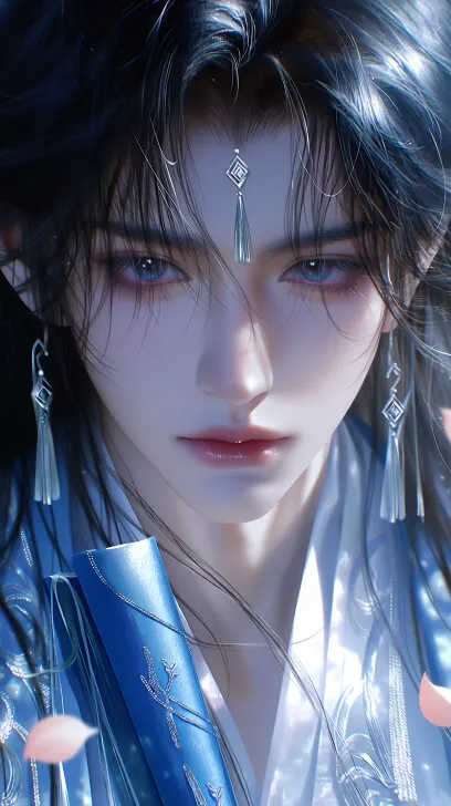 Midjourney Bot 更新时间:2026-01-27 00:06CG 厚涂,游戏CG ,丰富的色彩层次,质感细腻,真实光影,精致的细节,伪厚涂画风,细腻手绘质感,8k超清,真人近景,脸部特写,绝美光影,绝佳拍摄角度,俊美男性,黑色长发,发质柔顺乌黑透亮,银质碎钻流苏额坠,发丝根根分明,发质蓬松厚重,发丝飘逸飞扬,冷白皮,绝美的眼睛,卧蚕,双眼皮,双眸灿若星辰,睫毛纤长浓密,高挺的鼻梁,性感的薄唇,透明镜面唇釉,立体的轮廓,雪色里袍,雾霾蓝珠光薄纱外袍,银质碎钻流苏缀饰衣袂飘飘,手握蓝色古籍书卷,清冷感,身处桃林,花瓣飘落,极致唯美 --ar 9:16 --stylize 320 --niji 7