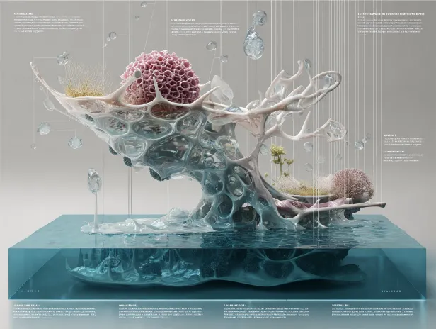 Midjourney Bot 更新时间:2026-01-27 00:08我是一名生物科技艺术家,为我生成作品效果图 材料与技术方案 材料:树脂、玻璃、金属、软质硅胶、可植入微藻/微生物的腔体结构; 结构:合成人体器官,例如女性(子宫)状腔体、血管状流体通道、透明窗等; 可选生物介入:在雕塑内部种植藻类或微生物,使其随时间改变色泽与密度。 3. 形式语言与呈现 雕塑形态介于“自然器官”之间,呈现“合成的器官”质感; 内部流体循环与微生物生长在部分透明区域可被观察到。 4. 媒介拓展机制分析 雕塑成为生物与技术的“容器媒介”,其形态由合成生物想象驱动; 时间维度的变化(生长、腐败、沉淀)成为重要的媒介层,合成雕塑单个展示。不要场景 --ar 4:3 --v 7 --stylize 100