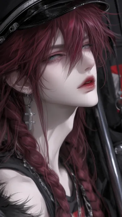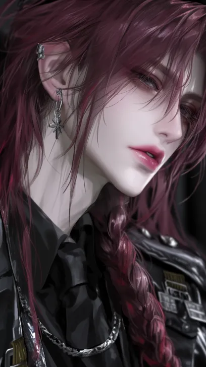 Midjourney Bot 更新时间:2026-01-27 00:10二次元厚涂融合韩系插画风格,男性,暗色调,暗粉色头发,长刘海,有长的麻花辫在身后,微长发,指挥官制服(黑色哑光),指挥官帽子(黑色哑光),近景,右耳带一个耳环(银色耳环不要太大),非常禁欲系,迷人危险,正面照,半身照,看起来非常高冷,睫毛发丝根根分明,柔顺蓬松,冷色调,光线明亮,给人一种危险的感觉,场景在审讯室里 --ar 9:16 --style raw --stylize 350 --niji 6 --profile enrcvog --no 纹身