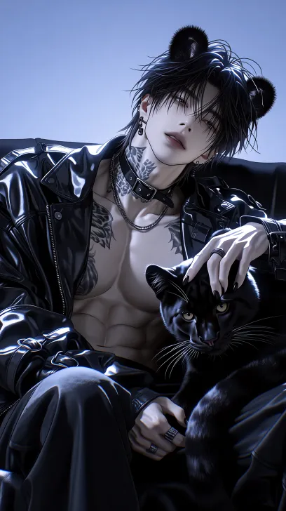 Midjourney Bot 更新时间:2026-01-27 00:11超精细半厚涂画风,黑豹兽人,东方美男子,成熟男性,男性,黑色短发(光感柔顺),棕金色狭长眼,气场十足,黑豹耳朵(绒毛质感),黑色黑豹尾巴,坐于黑色沙发上,他上半身微前倾,一手撑膝,一手抚摸一只毛发油亮的黑豹。他敞口皮衣滑落肩线,胸肌线条突出,流畅胸肌线条,黑色敞口皮衣,暗纹纹身(锁骨延伸至胸口),哥特暗黑风,CG质感,高清细节,危险慵懒气质,金属项圈(带暗扣),黑色绑带(手臂/腰部装饰),冷色调光影(蓝黑为主),氛围感拉满,8k分辨率,超精细纹理,皮肤肌理清晰,皮衣褶皱真实 --ar 9:16 --c 68 --weird 281 --stylize 766 --niji 7 --no 精灵耳朵