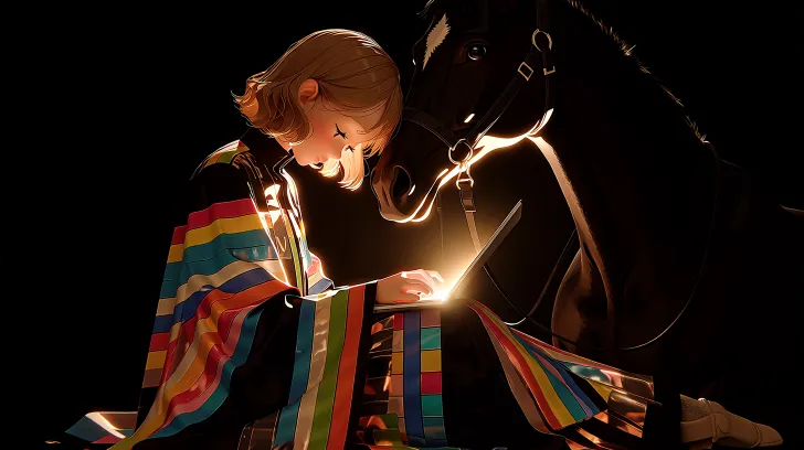 Midjourney Bot 更新时间:2026-01-25 00:12一位年轻的女性角色坐在一匹黑色马旁边,专注地在笔记本电脑上工作。角色有着短发和金色的发色,穿着带有亮色条纹的黑色外套,外套的设计时尚独特。电脑屏幕发出温暖的光,照亮了角色的手和面部,呈现出细腻的表情。整体风格现代且具有未来感。使用了高质量的3D渲染效果,视觉冲击力强。 --ar 16:9 --c 25 --weird 15 --stylize 151 --niji 7