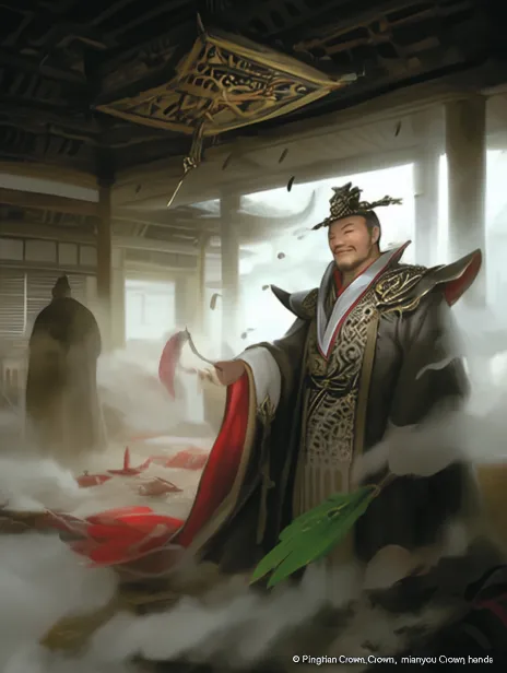 Midjourney Bot 更新时间:2026-01-25 00:13AI绘画提示词(最终详细版) 核心画风: 厚涂油画风格,画面笔触明显可见。背景使用模糊的深色粗犷笔触,描绘出古代宫殿的廊柱结构,以及远方正在升腾的灰色烟雾。整体色彩限制在黑色、白色、血红色与暗金色四种主色之内,形成强烈对比。画面追求一种庄重、寂静且充满悲剧张力的氛围。 构图与光影: 一道强烈的冷白色顶光,从画面正上方垂直向下照射,形成明确的光区。一位中年男性皇帝被此光线完全笼罩,位于画面正中央。 左侧剪影(先帝): 一个纯黑色的、边缘坚硬的侧面剪影。其轮廓显示出:头戴前后有垂旒的帝王冠冕(平天冠),身形挺拔,双手于胸前庄重地持握着一柄大型的玉制礼器(玉圭)。剪影为纯黑填充,无任何内部细节或五官。 中心人物(当代皇帝): 人物为约五十岁、体型明显肥胖的中年男性。 · 冠冕:头戴一顶大型金色帝王冠(冕),冠顶有平板,前后各垂挂十二串白色玉珠(旒)。冠冕佩戴歪斜,玉珠凌乱。 · 服饰:身穿正式礼服。上衣为玄黑色,绣有金色的日、月、星辰与龙形纹样;下裳为朱红色,绣有金色的火与斧形纹样。由于身材肥胖,华贵礼服在腹部紧绷起皱,且衣襟松散。 · 姿态与场景:深陷于一把宽大、木质陈旧、雕有蟠龙并被粗重锁链缠绕的宝座中。面部表情茫然,眼袋沉重,眼神空洞没有焦点。一只肥胖的手无力地垂搭在铺有金红色织锦的扶手表面,另一只手则勉强抬起,扶着头上即将滑落的沉重冠冕。 · 光影效果:顶光直接照亮其油腻的额头与鼻梁、异常苍白的脸部皮肤,以及礼服上紧绷并产生高光反射的丝绸面料。 右侧剪影(储君): 一个纯黑色的、边缘坚硬的侧面剪影。其轮廓显示出:头戴有冠梁和垂缨的太子冠帽(远游冠),身着锦绣长袍,身姿修长而挺拔,呈现出一种理想的站立姿态。剪影同样为纯黑填充,无任何内部细节。 互动细节: 从中心皇帝所坐宝座的下方及后方的阴影区域,延伸出数只“手”。这些手看不清来源,手腕处可见不同的奢华袖口,手指上佩戴着款式各异的玉石戒指和金属手镯。它们以看似轻柔实则不容置疑的动作,有的牵拉着皇帝宽大的袖口,有的虚覆在皇帝扶冠的手背之上。顶光照射的光柱中,有细微的尘埃颗粒在飞舞。 整体氛围: 一幅强调材质对比(丝绸的亮滑、金属的冷硬、木质的粗糙、皮肤的油腻)与戏剧光效的厚重油画。主题聚焦于一位被自身身份、历史重压与无形操控所困的帝王。画面背景中的宫殿与硝烟暗示着动荡的外部世界,而前景中心是凝固的寂静与无声的崩坏。 --ar 3:4 --weird 2483 --stylize 100 --niji 6 --sref https://images.gogpt.vip/aigf/m_origin/20260125/2037869/3j7uii79mgim4o5p.jpg --cref https://images.gogpt.vip/aigf/m_origin/20260125/2037869/6yrldb49szbhd5nt.png --cw 100