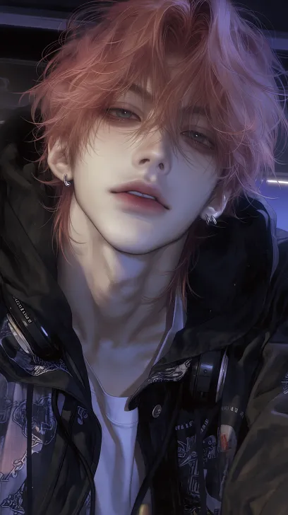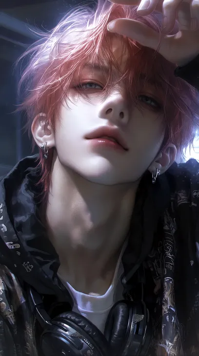 Midjourney Bot 更新时间:2026-01-25 00:15男子,飘逸蓬松凌乱浅红头发,头发挡眼,短发,薄唇紧闭,哑光, 耳朵佩戴银色小巧耳钉(衣服有些许自然褶皱),长相痞帅, 纯黑瞳孔,瞳孔漂亮,眼神迷离恍惚,五官深邃立体,皮肤为健康的小麦色 疯批感,病娇感,嚣张感,桀骜不驯感,黑色外套有外套帽子,带上外套帽子,衣服上有富有设计感装饰,内搭白色衣服,戴电竞耳机挂脖子上,桀骜不驯感,粗汉感,移开视线,脸部有放大特写,脸部的细节描写 近距离,正面 背景为电竞房,环境昏暗,有氛围感灯打下,动作自然懒散,伸手挡屏幕 水润唇,高级CG,伪厚涂插画,磨砂画质,伪厚涂插画,冷色调,bjd质感 --ar 9:16 --stylize 779 --niji 7