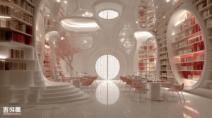 Midjourney Bot 更新时间:2026-01-25 00:15中式奇幻美学图书馆。模仿电影大师阿莫多瓦风格,模仿电影《山中传奇》。复古未来风格,怪诞氛围。超大长条形室内空间,正面三个门洞:中间是太极元素的门,两侧为开放式洞门。室内左右是到顶书架,模块化梅花元素区域。桌椅。造型吊顶,发光灯膜。白色,玫红色。 --ar 16:9 --v 7 --stylize 100