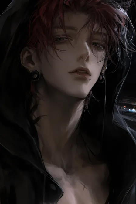 Midjourney Bot 更新时间:2026-01-26 00:01一个看夜景的男人,正面,黑色兜帽衫,唇下痣,有着黑色瞳孔,红色三七分发型,黑耳钉,黑色背景,嘴角勾起一抹坏笑,大佬气质,掌控者,一种高高在上的感觉 --ar 2:3 --stylize 470 --niji 6 --profile spr1pcg cjgdoqp pb4sfr1 --no 手