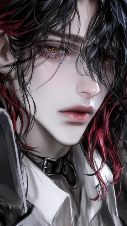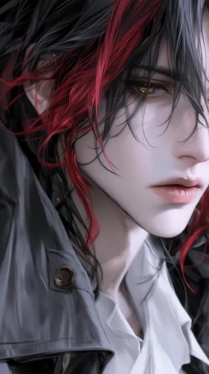 Midjourney Bot 更新时间:2026-01-26 00:01黑红色渐变半长发,刘海,动画风格的男人,金色眼睛,清冷气质冷漠,唯美,里面穿着白衬衫外面深灰色风衣,皮肤纹理。(半身像)质感。16K超清,简约暗色背景 --ar 9:16 --stylize 328 --niji 6 --profile 4u187i8 9fn2l1l --no 仰头,眼镜,纹身,张嘴,微笑,耳饰