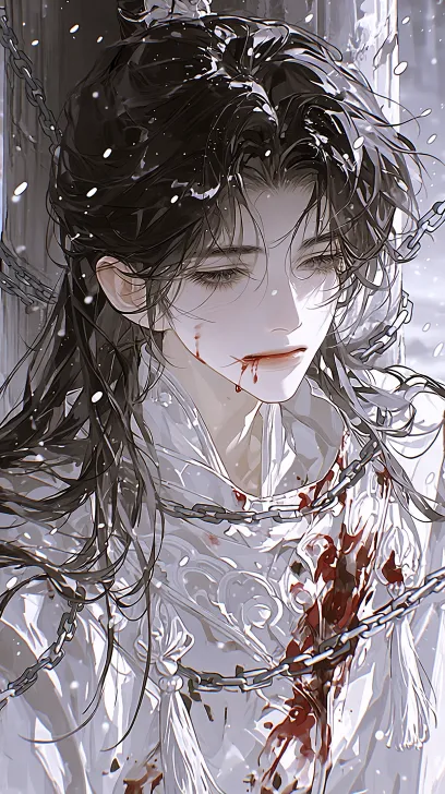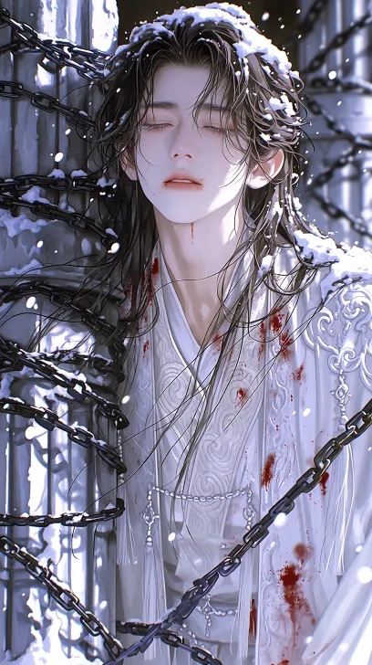 Midjourney Bot 更新时间:2026-01-26 00:03超精细半厚涂,2.5D,cg质感,凛冽的北风裹挟着鹅毛大雪,一个美少年,黑色长发披散,柔顺,光泽,楚楚可怜,超长睫毛,根根分明,绝色少年长发飘飘,穿着白色中国汉服长袍,华丽花纹,白色流苏,衣服上有血迹,他胸口有铁链锁,他被锁链绑在石柱子上,铁链环绕许多圈,华丽精致精美绝伦华丽的素色长袍,凄美,背景是中国风宫殿 --ar 9:16 --c 68 --weird 281 --stylize 766 --niji 7 --no 精灵耳朵
