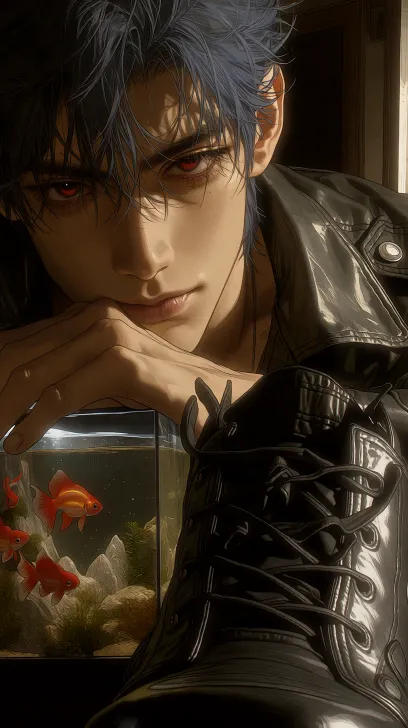 Midjourney Bot 更新时间:2026-01-26 00:04一个成年拽哥,脸部重点,邪魅,杰作,红色眼睛,蓝色色头发,最高品质,细腻描绘,精致眼神,8K分辨率,先进 CG 技术,半写实伪厚涂层,动漫风格,一位面容精致俊朗的年轻男子,简约大气的欧式房间,凌乱短发,眼角有痣,长睫毛,柔嫩白皙的皮肤,深邃眉骨,斜心构图,侧面视角,手指按在镜头上,五只张开,身后是房间布置有透明鱼缸,鱼缸逼真引人注目,是活力满满的生态鱼缸,有红色金鱼和许多假山水藻,身后是卧室房门,电影级光影效果,高端质感,暖色调色彩,低饱和度,细节修复,光线追踪技术,硬朗的面部轮廓,五官坚毅,镜头焦点,昏暗灯光,阴翳脸庞,帅得惊为天人,背景实化,若有所思的表情,漫画风格融合了厚涂,现代男性漫画角色风格,脸部比例优越,阴郁富有掌控力的人物,镜头从胸膛到头部,黑色为主,黑暗的光线,窗户有阳光透进来,背景为房间门口 黑色眼睛,黑色的头发,冷白的皮肤,近距离,男生宿舍,穿的紧身连体短款上衣搭配皮质外套,肩背的肌肉线条透过布料凸出来,皮质手套,俊美阴暗的气质,24k画质,精细刻画,素描感,复杂笔触,极具写实意境的漫画线条,高色彩度,电影焦距,皮肤质感偏黄,神态仔细,矜贵的财阀少爷 --ar 9:16 --c 26 --weird 207 --stylize 1000 --niji 7
