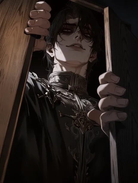Midjourney Bot 更新时间:2026-01-26 00:06一个五官姣好但有黑眼圈的成年男人,人身处一个竖着的棺材里,但一手抓着棺材板,同时俯视着镜头,体现轻蔑高傲感,男人的服饰风格偏向欧洲中世纪贵族的风格,整体氛围要求具有压迫感 --ar 3:4 --stylize 283 --niji 7
