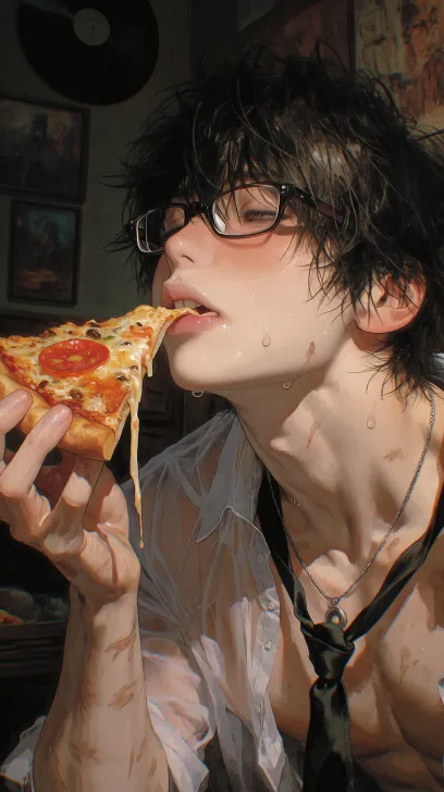 Midjourney Bot 更新时间:2026-01-26 00:10俊美少年,中等长度的凌乱蓬松黑发,微张的薄唇吃披萨,脸颊泛红,迷离的半睁眼眸,纤细却有肌肉线条的身材,身上有薄汗,银色细链项链,薄纱衬衣,领带松垮,纤细修长的手指拿着披萨吃,手臂上的擦伤,戴着黑框眼镜 昏暗的室内环境,墙上有很多挂画和唱片,近距离视角,慵懒又脆弱的病娇气质 超写实厚涂,Kawacy风格,细腻的皮肤纹理,柔和的明暗对比,电影级打光,低饱和度色调,暧昧的氛围感 --ar 9:16 --stylize 1000 --niji 7