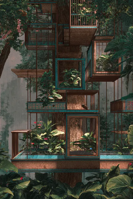 Midjourney Bot 更新时间:2026-01-26 00:02I am now an entrepreneur and need to generate a product concept map to attract consumers and investors. The product is based on a climbing pet feeding box and requires a beautiful interior design for product display. The length, width, and height of the climbing box are 0.8m * 0.5m * 1.2m, and a tropical rainforest style landscape needs to be created inside. Two turtles need to be raised, and a small shallow water area is required for the landscape, with the water depth not exceeding the height of the turtles. The style and content of landscape design should be based on the rainforest style, symbolizing longevity, health, wealth accumulation, stability, tranquility, wisdom, knowledge, and family harmony. It requires strong emphasis on feng shui, and the landscape design must be achievable in real life, without any mystical elements. Garden: 2. Bagua, Shangri La, Shanhaijing, Dao, Koi, Rainforest: 3. Garden Background: 2. Weeds, Tropical Rainforest, Cyberpunk City, Cyberspace, Bright: 2. Dingdar Effect, Natural Lighting, Bright, Traditional Chinese Architecture, Colored Glass, --ar 2:3 --v 7 --stylize 100