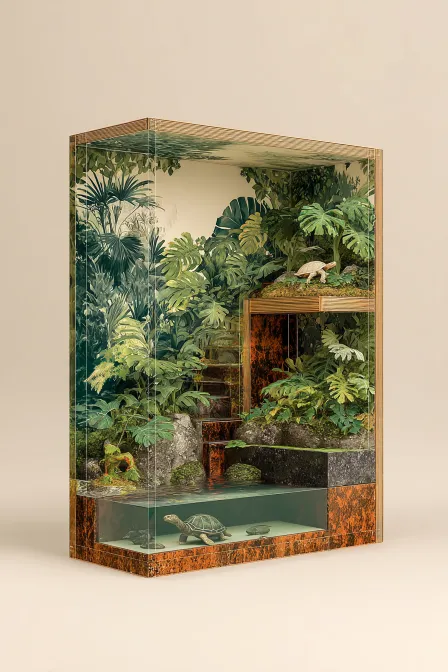 Midjourney Bot 更新时间:2026-01-26 00:09https://images.gogpt.vip/aigf/m_origin/20260126/2040023/t7cugn2spcx9bq3n.jpg I am now an entrepreneur and need to generate a product concept map to attract consumers and investors. The product is based on a climbing pet feeding box and requires a beautiful interior design for product display. The length, width, and height of the climbing box are 0.8m * 0.5m * 1.2m, and a tropical rainforest style landscape needs to be created inside. Two turtles need to be kept, and these two turtles need to appear in the generated image. Landscaping requires a small portion of shallow water, and the depth of the water should not exceed the height of a turtle. The style and content of landscape design should be based on the rainforest style, symbolizing longevity, health, wealth accumulation, stability, tranquility, wisdom, knowledge, and family harmony. It requires strong emphasis on feng shui, and the landscape design must be achievable in real life, without any mystical elements. We need to place a Tang Sancai or ceramic ornament that has achieved instant success inside, and this ornament should be very conspicuous. Garden: 2. Bagua, Shangri La, Shanhaijing, Dao, Koi, Rainforest: 3. Garden Background: 2. Weeds, Tropical Rainforest, Cyberpunk City, Cyberspace, Bright: 2. Dingdar Effect, Natural Lighting, Bright, Traditional Chinese Architecture, Colored Glass, --ar 2:3 --v 7 --stylize 100 --iw 0.25