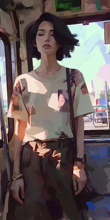 Midjourney Bot 更新时间:2026-01-26 00:10Hand drawn illustration style, realistic brushstrokes, the main subject of the picture is a thin young woman with black short curly hair, a side face and a head up. She is wearing a loose light colored short sleeved shirt, a printed short top, and dark brown wide leg pants. She is slung over a vintage canvas bag, standing in a bus with a wristband in hand. Outside the window is a Saigon street scene, with strong side backlighting, forming a sharp contrast between light and dark, with soft diffuse reflection light spots. The overall color scheme is a retro color scheme of warm brown, light gray, and cobalt blue, creating a relaxed and lazy artistic atmosphere. The picture has a slight film grain feeling. --ar 1:2 --stylize 100 --niji 6 --sref https://images.gogpt.vip/aigf/m_origin/20260125/2037724/ezwf5wtrix2fcwxa.png --cref https://images.gogpt.vip/aigf/m_origin/20260125/2037724/ezwf5wtrix2fcwxa.png --cw 34