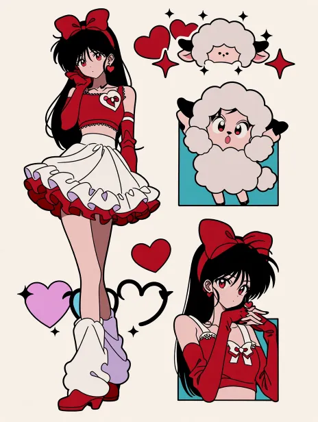 Midjourney Bot 更新时间:2026-01-21 00:04可爱的小女孩,全身,立绘,多个立绘,黑色长发,长鬓角,红色眼睛,头上戴着红色蝴蝶结发箍,阴郁的表情,眼睛元素,红白色系服装,简约的裙子,眼睛元素,羊元素,羊拟人,爱心元素,红色长手套,偶像服装,时尚秀 --ar 3:4 --c 25 --weird 250 --stylize 1000 --niji 7 --sref https://images.gogpt.vip/aigf/m_origin/20260120/2026762/2z6ublg6y5y1qbhm.jpg --sw 100