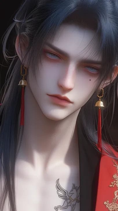 Midjourney Bot 更新时间:2026-01-21 00:05https://images.gogpt.vip/aigf/m_origin/20260121/1690768/uugz1wh5u570u8uz.jpg 细腻动漫画风,整体为暖色调,超高清画质,高级质感,帅气,动漫画风自然,画质高清,模特写真风,古风帅哥,精致,阴暗对比,黑色长发用红头绳绑着,皮肤白皙,右眼睛下有一颗痣,帅哥,20岁,画风是高级CG,长得特别特别好看,带着铃铛耳环,红色古代服装,半身特写,高级CG画风,帅哥,大眼睛很漂亮,衣服领口打开,身上有麒麟纹身,少年感,水墨丹青画风 --ar 9:16 --style raw --stylize 100 --niji 6 --no Beard、