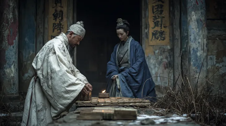 Midjourney Bot 更新时间:2026-01-21 00:06https://images.gogpt.vip/aigf/m_origin/20260121/2034336/c1urhh37n8owder7.webp 帮我生成图片: 人物一:孔生,动作于神案前,正呵冻手,欲拨亮将熄的油灯。身体消瘦,略带寒瑟。服饰着洗得发白的蓝色旧儒衫,袖口有磨破的补丁。 人物二:皇甫公子,动作立于庙门外,一手轻叩斑驳门板,一手负于身后。身体姿态挺拔优雅。服饰身着月白色暗云纹锦袍,外罩银狐裘披风,玉冠束发。 环境构成:残破山神庙,蛛网垂挂,壁画剥落。地上有枯草,孔生的简单行囊(书箱、铺盖)靠在角落。门隙开一缝,寒风卷着几片雪花侵入。案上摊开的书卷被吹动。 光源主要来自案上一盏很小的油灯(暖黄光),整体环境昏暗,照亮孔生和身前小范围。门外是清冷的蓝色雪夜月光,勾勒出皇甫公子优雅的身形,他脚下及身后雪地无足迹。 画面以内暖外冷对比为主。庙内是昏黄、赭石的暖色调,庙外是花青、墨蓝的冷色调,象征两个世界的初次交汇。 画面风格为水墨工笔结合数字板绘效果描绘,构图具有强烈的摄影感和透视感。 高分辨率,国墨, --ar 16:9 --v 7 --stylize 234 --iw 0.25