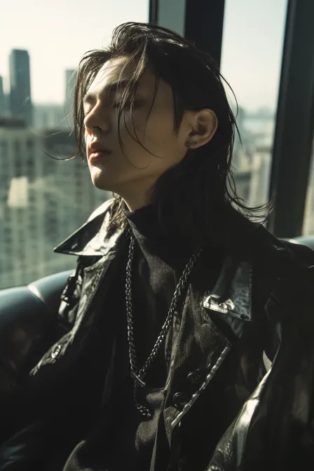 Midjourney Bot 更新时间:2026-01-21 00:13男子全身图,黑色长发,灰色眼睛,外搭黑色哑光风衣,内搭黑色高领,风衣上挂着银链子,嗯,坐在沙发上,背景是落地窗,落地窗外是高楼大厦。透着酒醉金迷感 --ar 2:3 --style raw --stylize 77 --niji 6 --profile 8rfr9yc
