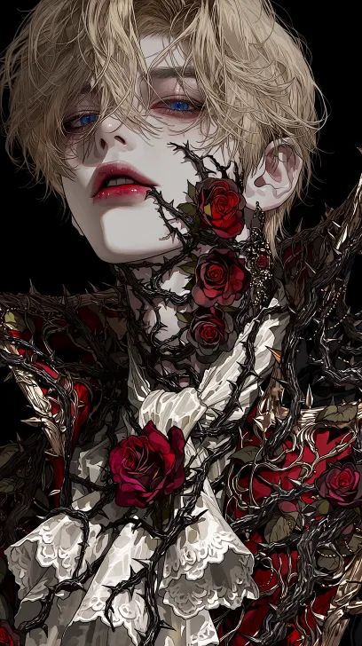 Midjourney Bot 更新时间:2026-01-21 00:14美男,少年,金发碧眼,华美的洛可可风装饰被大量尖锐的黑色荆棘和猩红的蔷薇撕裂、缠绕。蔷薇的根系仿佛直接生长在他皮肤上。脸色苍白,但嘴唇艳红。超近景 --ar 9:16 --c 1 --seed 982793318 --weird 20 --stylize 557 --niji 7