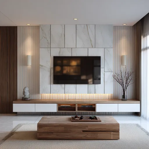 Midjourney Bot 更新时间:2026-01-21 00:03I have a TV wall, with dimensions of 7m wide and 2.6m high, and I want to make a floor cabinet that is 35cm high, with cabinets designed to the top on both sides. In the middle, there will be a simple wall-mounted TV, with a white decorative panel behind the TV, adorned with vertical lines. The cabinet has two colors: one is white, and the other is raw light black walnut board. The cabinet can be appropriately decorated with brown glass doors, and it should not be symmetrical on both sides; the right side should be wider than the left side. --ar 1:1 --v 7 --stylize 100