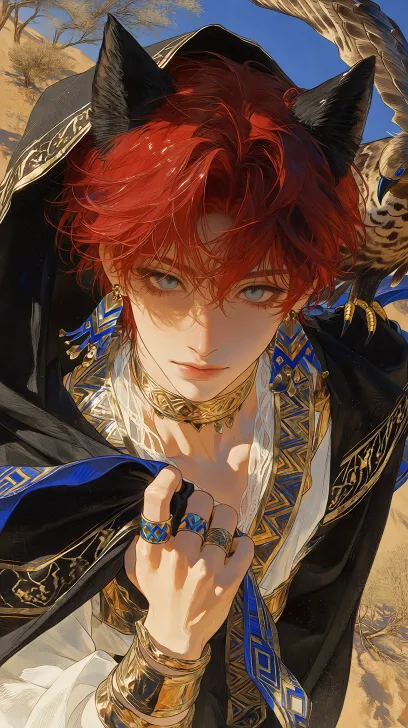 Midjourney Bot 更新时间:2026-01-20 00:15广角镜头,俯拍视角,高角度拍摄,细长的瓜子脸型,半拟真厚涂质感,厚涂渲染,肌肤理线条自然明显,面部刻画细节,从下往上拍摄,动态视角,瓜子脸,精致细腻厚涂涂抹笔刷,精致厚涂,近身照,人物平视镜头绘画,2D伪厚涂风格,画面彰显人物主体,单人男少年厚涂风格,猫猫眼,长睫毛,精致的眼眸,精度五官,异域少年,红色短发凌乱蓬松,浅蓝眼睛,清冷的眼神,头戴黑色连帽披风(头上还有黑色狼型兽耳,披风边缘镶金纹与蓝底金纹方形饰片),左手扯披风领口,身着白黑金蓝配色异域服饰(内层白纱露锁骨,还有蓝色和金色的菱形装饰),饰品有耳戴蓝色菱形耳坠、颈间金质项圈、手指戴着金戒与蓝宝石戒指,手臂上有金色臂环,肩膀上立苍鹰(羽毛棕黑相间),背景是荒漠戈壁,有枯树、蓝天,黑白金蓝主色调,暖调自然光斜射人物,发丝红亮有层次,披风面料垂坠厚重,金属饰品冷冽反光,苍鹰羽毛纹理清晰,荒漠背景质感粗糙,光影对比鲜明,氛围感神秘孤傲,8K,厚涂细腻,精致清透美丽,亚洲审美,伪bjd半厚涂画作,细腻笔刷高精渲染,完美构图,清透画面,软笔,笔触,高清质画,动态姿势,动态视角,远景,美丽。 --ar 9:16 --c 15 --stylize 600 --niji 7 --no 侧脸,脸部特写,3D画风,现实画风,扭曲脸部,奇怪比例,非p值画风,人物畏手畏脚,人物模糊,害羞,可爱,萌妹子,萌,幼态脸,眼睛发光,仰头,大红厚嘴唇,水滴,丝带,绷带