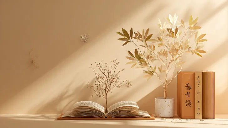 Midjourney Bot 更新时间:2026-01-20 00:15柔和简约3D渲染,一株植物从旧日记本中生长出来,左侧是干枯小苗与‘去年’字样,右侧是繁茂枝叶与‘此刻’字样。背景为暖米色,光影从右侧打下,充满希望感。平面设计风格,清新治愈。 --ar 16:9 --v 7 --stylize 100