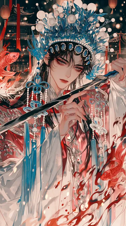 Midjourney Bot 更新时间:2026-01-20 00:15动态姿势,拟真质感,BJD质感厚涂,厚涂风格,半拟真质感,梦幻,清透,厚涂,厚涂,好看水灵灵的眼睛,水光肌肤,bjd质感,厚涂渲染,长脸型,半厚涂画风,笔触清透有辨识度,色块衔接自然不堆砌,保留轻微笔触感却不厚重,线条利落不拖沓,色彩搭配新颖不撞款,生图质感无过度美化,清透,皮肤纹理真实可见,光影柔和不突兀,画面彰显人物主体,厚涂风格,厚涂风格,厚涂风格,一位有着深黑长直发的清冷俊美男子,头戴蓝白渐变的戏曲凤冠,凤冠上装饰着白色珍珠、蓝色蝴蝶纹样与镂空花纹,两侧垂下蓝色流苏与珍珠串饰,身穿红粉渐变的古风婚服,衣身布满精致的刺绣花纹,双手拿着古风长剑,剑靠近脖子,旋转,动态,血液飞溅,忧伤的表情,火焰遍布周围,背景是古风建筑物高楼上,点缀着红色的飘带与朦胧的光斑,左侧有红色的鱼形装饰,背景有孔明灯,整体色调以红、蓝、黑、白为主,光影柔和且充满氛围感,画风细腻华丽,融合了中式戏曲与暗黑古风元素,充满凄美又魅惑的氛围感,美丽,梦幻,细腻笔刷高精渲染,完美构图,清透画面,软笔,笔触,高清质画,动态姿势,动态视角,远景,美丽。--niji 7 --ar 9:16 --c 15 --stylize 300 --niji 7 --no 侧脸,脸部特写,3D画风,现实画风,扭曲脸部,奇怪比例,非p值画风,人物畏手畏脚,人物模糊,害羞,可爱,萌妹子,萌,幼态脸,眼睛发光,仰头,大红厚嘴唇,水滴,丝带,绷带