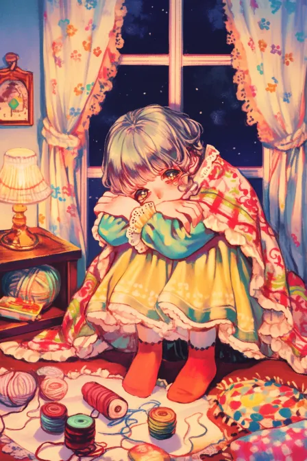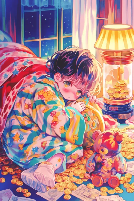 Midjourney Bot 更新时间:2026-01-20 00:15【主题:星夜与零钱罐】 元素词:打翻的零钱罐 未完成的星空画 暖黄台灯 散落的账单 星月图案睡袍 缝补的毛熊 颜料渍地毯 暖黄台灯照亮打翻的零钱罐,硬币滚到未完成的星空画边。三头身小女孩裹着星月睡袍,抱着缝补的毛熊坐在地毯上。她望向画布上漩涡般的靛蓝与银白,又低头看着脚边散落的账单,小小的手指轻轻摸了摸干涸的颜料渍。 --ar 2:3 --stylize 100 --niji 6 --sref https://images.gogpt.vip/aigf/m_origin/20251212/28068/30ld5mr8htu11upc.jpg https://images.gogpt.vip/aigf/m_origin/20251212/28068/hcnkwo6dl99hyizn.jpg https://images.gogpt.vip/aigf/m_origin/20251212/28068/cw1fgui11vfts7bx.jpg